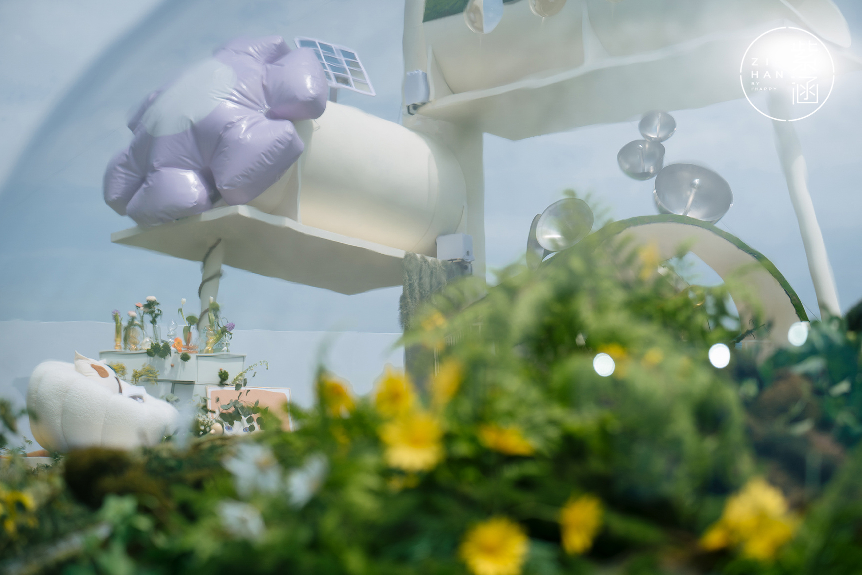 伴随着乐园的播报声与市集的欢声笑语,我们跟随时空飞船来到了“生生乐园”,会逆向生长的绿植,巨型的蘑菇和温暖的花房,将森系、文艺、趣味的品牌风格极致地展现了出来。